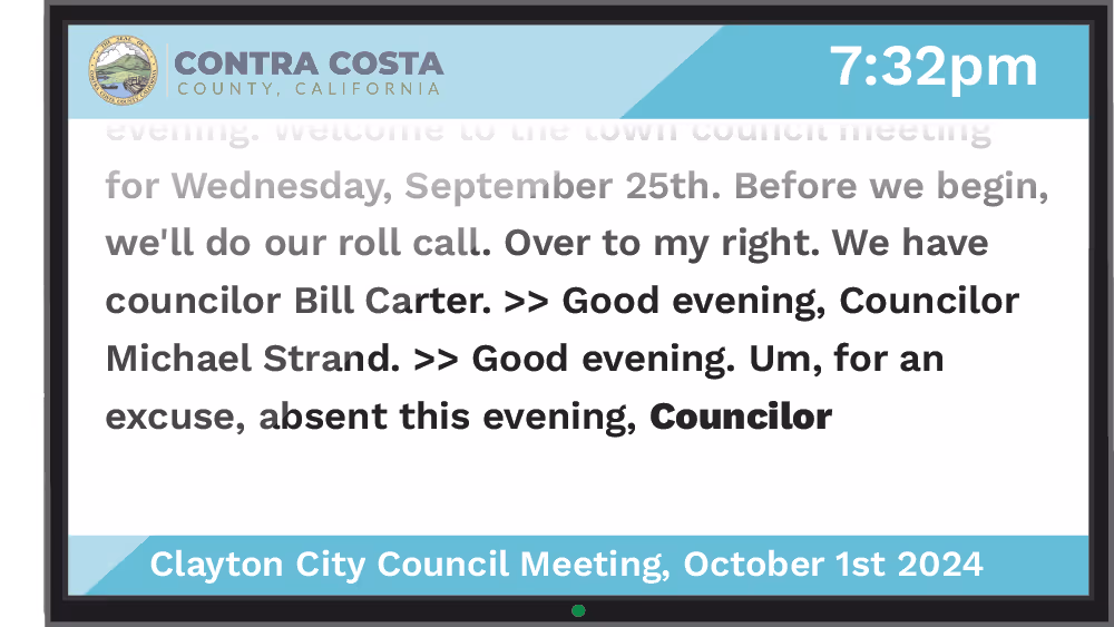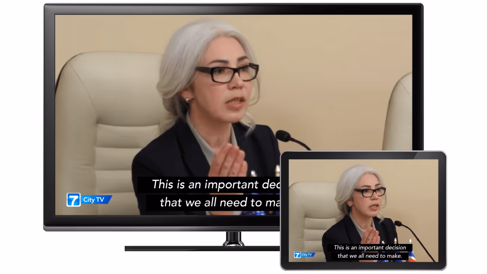 Open captions are displayed over your meeting's live video feed. This is a perfect solution for entryways, hallways, and overflow areas. Open captions allow viewers to see and read what is happening in the chambers without having the sound on the TV.